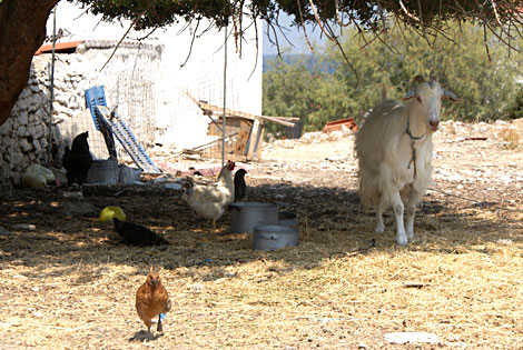 Υπάρχουν στο νησί σπίτια που φιλοξενούν 40 γάτες, ή 5 κι 6 και 10 σκυλιά, κατσίκες, κοτέτσια με αλανιάρικα πουλερικά, άλογα, υπάρχουν νοματαίοι που περιορίζουν τα δικά τους καθημερινά προκειμένου να μη λείψουν οι ζωοτροφές. Υπάρχει το Καταφύγιο Άγριων Ζώων, και η ΦΑΖΑ, οι γάτες που γουργουρίζουν και γλείφονται στους καναπέδες των φίλων σου, φέρνοντας πεσκέσι κανέναν αρουραίο όποτε παραγίνεται το σκουπιδαριό, τα σκυλιά, να σου γλείφουνε τα πόδια αν σε νιώσουν κουρασμένο, καρδερίνες και πετροκότσυφες να σου κελαηδάν. Κατσίκες, που σου κάνουν τζάμι το χωράφι βοσκώντας, να μη χρειάζεσαι ούτε ξεχορτάριασμα ούτε τίποτε, (προσοχή μόνο μην τις αφήσετε ανεξέλεγκτες γιατί δε θα αφήσουνε καινούριο δέντρο να φυτρώσει.) Θυμάμαι το φίλο μου τον Τότη, τον χάσαμε τελευταία, δυστυχώς. Ζούσε μόνος του, στα 80 κάτι, και ντρεπόσουν να πατήσεις στο σπίτι του από την πάστρα. Μα δεν ήταν μόνο το σπίτι – πλάι ακριβώς, υπήρχε η μάντρα με τα ζωντανά. Κατσίκια, κότες, χήνες, ένα σκυλί στην πίσω βεράντα, δυο τρεις γάτες να λιάζονται αενάως στη μπροστινή. Και παντού, τα πάντα πεντακάθαρα, φροντισμένα από έναν μόνο του άνθρωπο στα 80 και κάτι. Που αγαπούσε βαθιά τη ζωή, όπως λίγο-πολύ όλοι μας εδώ στην Αίγινα του 2012.