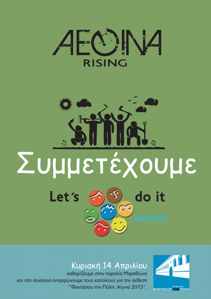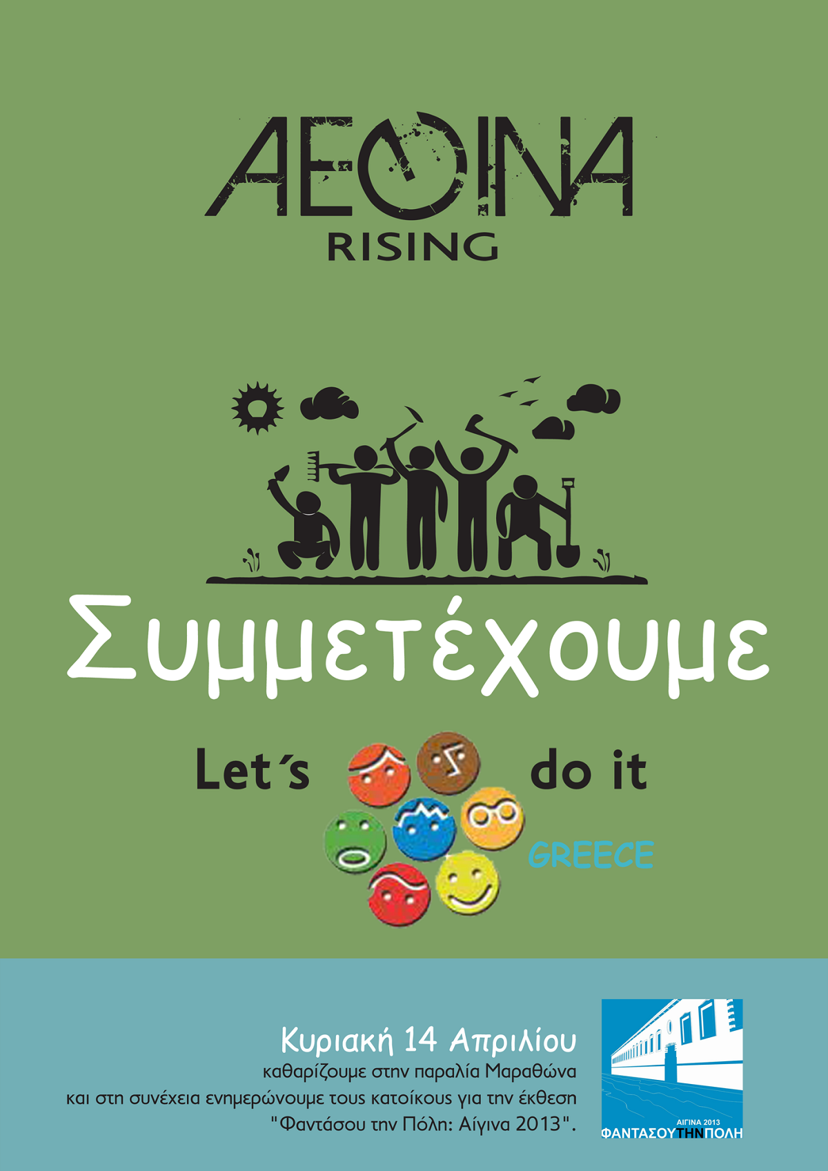 Στα πλαίσια της διεθνής εθελοντικής δράσης Let’s do it, και της πρωτοβουλίας του Δήμου Αίγινας, συμμετέχουμε, καθαρίζοντας στην περιοχή του Μαραθώνα, και στην συνέχεια θα ενημερώσουμε τους κατοίκους της περιοχής για την έκθεση <Φαντάσου την πόλη: Αίγινα 2013>