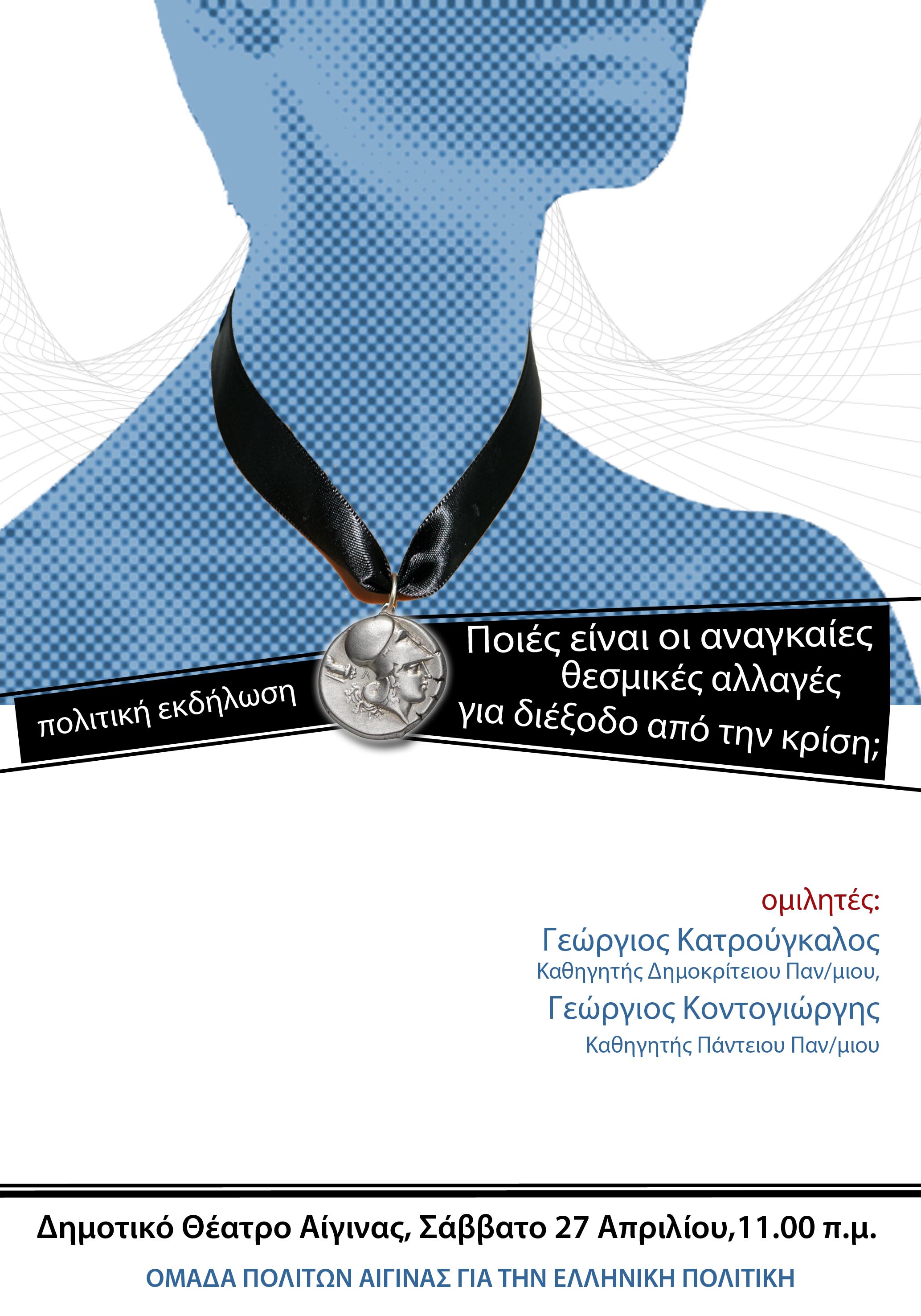 Πραγματοποιήθηκε το Σάββατο 27/4/2013, στο Δημοτικό Θέατρο Αίγινας, με ιδιαίτερη επιτυχία, η πολιτική εκδήλωση «ποιες είναι οι απαραίτητες θεσμικές αλλαγές για διέξοδο από την κρίση;», με ομιλητές τους καθηγητές κκ Γ. Κατρούγκαλο, συνταγματολόγο και Γ. Κοντογιώργη, πολιτικό επιστήμονα.