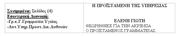 Παρακαλούμε να εξετάσετε τα αναγραφόμενα και να προβείτε στις δέουσες ενέργειες αρμοδιότητάς σας, προς επίλυση του θέματος, με γνώμονα την ασφάλεια και την εξυπηρέτηση των ασθενών.
