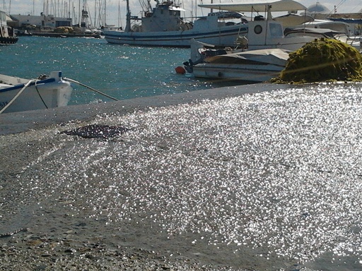 Σήμερα το μεσημέρι, περί τη μια, το λιμάνι δεν αποτελούσε τίποτε το διαφορετικό, παρά ένα μικρό και παροδικό εμπόδιο των κυμάτων που με ορμή το διέσχιζαν. Το θέαμα, που θα δείτε και στις πιο κάτω φωτογραφίες, έκανε εντύπωση στους ταξιδιώτες που ανέμεναν τα πλοία. Τίποτε δε στεκόταν όρθιο και αλώβητο δίπλα στο κύμα, όσο η ταμπέλα για το “μέγα” κι ακόμη ανεκπλήρωτο έργο του υποθαλάσσιου αγωγού.