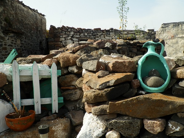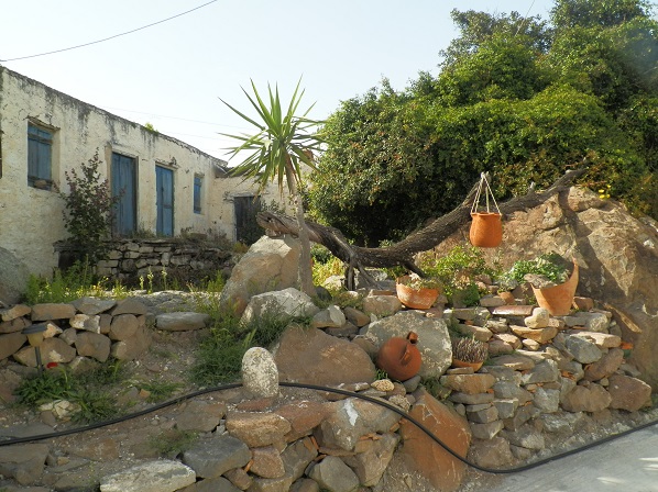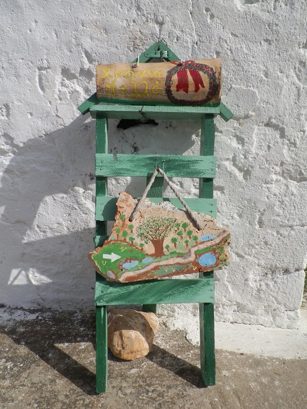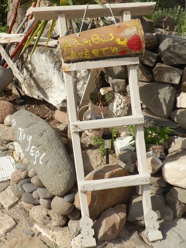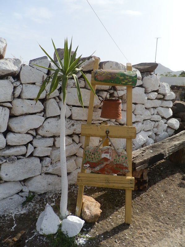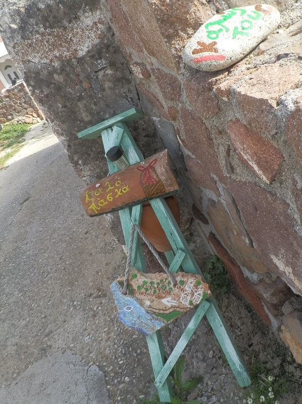 Έξω από την κάθε αυλή, καλόγουστες εικαστικές παρεμβάσεις, πασχαλιάτικες ευχές ζωγραφισμένες σε κεραμίδια, κομμάτια ξύλο, πήλινες γλάστρες, μικρές σκαλωσιές με μπρούτζινα φωτιστικά, όπου σταθεί το μάτι σου μια φροντίδα, μια ξεχωριστή αγάπη για τον κοινόχρηστο χώρο.