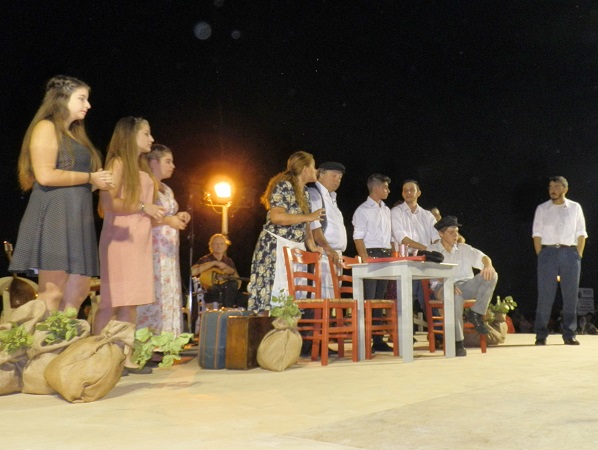 Στην παράσταση συμπράξαν 3 αριστοκρατικά οχήματα του Σ.Κ.Ο.Α., μεταφέροντας στη σκηνή κάποιους από τους ηθοποιούς, κι ένα καΐκι που στην εξέλιξη της παράστασης έφερε τους υπόλοιπους δια θαλάσσης, ενώ έπαιξαν οι ερασιτέχνες ηθοποιοί Βατικιώτης Λευτέρης, Πάσχα Στέλλα, Μπόγρης Νεκτάριος, Καρβούνης Νικόλας, Δημητρόπουλος Αλέκος, Θωμάς Ηλίας, Μεθενίτη Νεκταρία, Λαδά Μαριάνθη, Χλέτσου Ναταλία, Μαρίνη Μιχαέλα, Νταμουράκη Χαρά, Αξιώτη Έφη και Μπήτρου Αντωνία, με αφηγήτρια την Μαίρη Σταυρίδου.