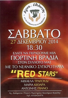 Το νεανικό συγκρότημα Red Stars, η Μιχαέλα στο τραγούδι, η Μαρία στην κιθάρα κι ο Αντώνης στο πιάνο, υπόσχονται να μας ξεσηκώσουν με τις ροκ και όχι μόνο νότες τους.