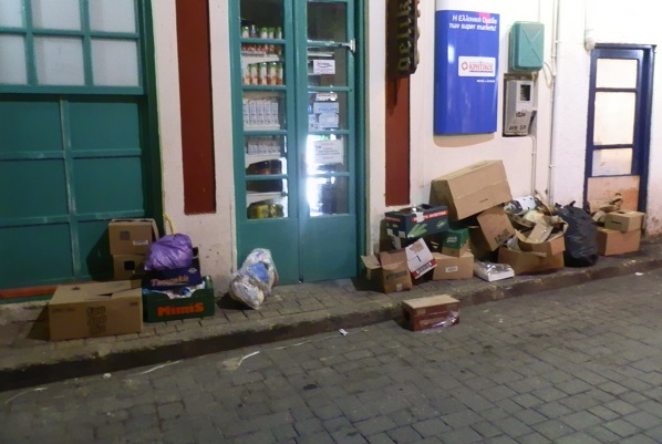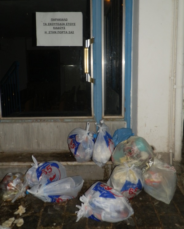 Μια συνήθεια και διαδικασία χρόνων, που εδράζεται στη βολή καταστηματαρχών, εργαζόμενων και κατοίκων αφενός  και στην προθυμία του Δήμου να παίρνει τα σκουπίδια μας από τη πόρτα μας αφ’ ετέρου.