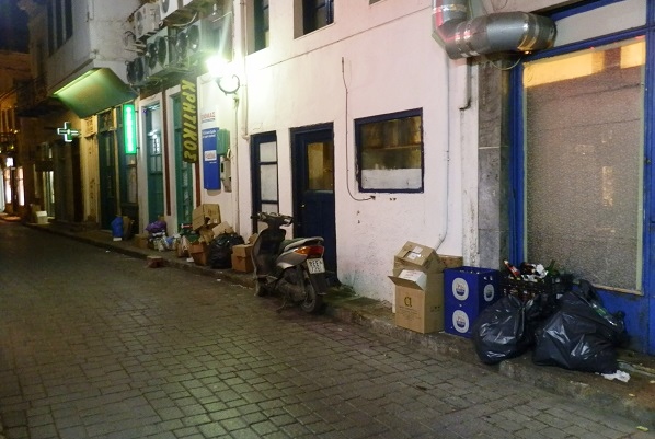 Μετά το κλείσιμο των εμπορικών καταστημάτων, από τις 21.00, και κατά τις ώρες λειτουργίας των καταστημάτων αναψυχής, οι επιχειρηματίες βγάζουν τα απορρίμματα τους έξω από την πόρτα τους, για να τα πάρει το απορριμματοφόρο του Δήμου, το οποίο περνάει καθημερινά, τις πρωινές ώρες για την αποκομιδή τους. Υπάρχουν βέβαια και οι εξαιρέσεις, κάποιοι επιχειρηματίες δεν περιμένουν να βραδιάσει, τα βγάζουν στο πεζοδρόμιο, το δικό τους ή το απέναντι, καθ’ όλη τη διάρκεια της ημέρας.