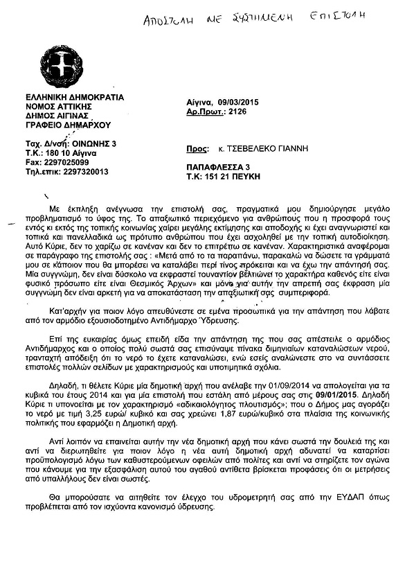 Επίσης,πάλι για λόγους ηθικής τάξεως. θέλω να θυμίσω ότι σε κανένα σημείο της επιστολής μου έγιναν τα αναφερόμενα δυσμενή σχόλια (“ασύντακτα”, “ανορθόγραφα”, “εκφοβιστικά”) επάνω στο κείμενο της απάντησης (30-1-15) του κ. Αντιδημάρχου η οποία άλλωστε είναι άψογη και γραμματικά και συντακτικά, χωρίς καμιά εκφοβιστική έκφραση , και τουναντίον, μου έδωσε την πολύτιμη για μένα και τον κήπο μου πληροφορία ότι δεν έχει διακοπεί η υδροδότηση. Ειλικρινά τον ευχαριστώ και ζητώ συγγνώμην αν στενοχωρήθηκε, στην περίπτωση βεβαίως που έλαβε γνώση του περιεχομένου της επιστολής του κ. Δημάρχου (9-3-15).