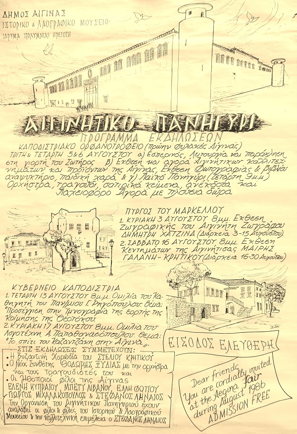 Καταρχήν, επιστρέφουμε στο 1986, επί δημαρχίας Γιώργου Γιαννούλη. Η αφίσα του εξώφυλλου είναι από “αιγινήτικο πανηγύρι” που έγινε με δική του πρωτοβουλία, και με την επιμέλεια του Στέφανου Ληναίου, ο οποίος είχε σπίτι εδώ, κι όπως θυμάται η σύζυγος του τότε δημάρχου κ. Δανάη Γιαννούλη“Είχαν στήσει με την Ε. Φωτίου και μια άλλη, εξαιρετική παράσταση, το “Καληνύχτα, Μαργαρίτα,” πάλι στο Ορφανοτροφείο. Γίνονταν πολλά πράγματα μέχρι το 1988, που έμεινε δήμαρχος ο Γιώργος, στον συγκεκριμένο χώρο, και πολύς κόσμος ερχόταν να τα παρακολουθήσει.”