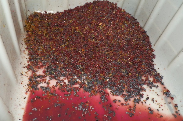 Ακολουθεί το “πάτημα” και η τοποθέτηση του μούστου μαζί με τα στέμφυλα (τσάμπουρα) και τα περισσότερα κοτσάνια σε δοχείο, για την ζύμωση (ουσιαστικά δηλαδή ακολουθούμε την μέθοδο της ερυθρής οινοποίησης).