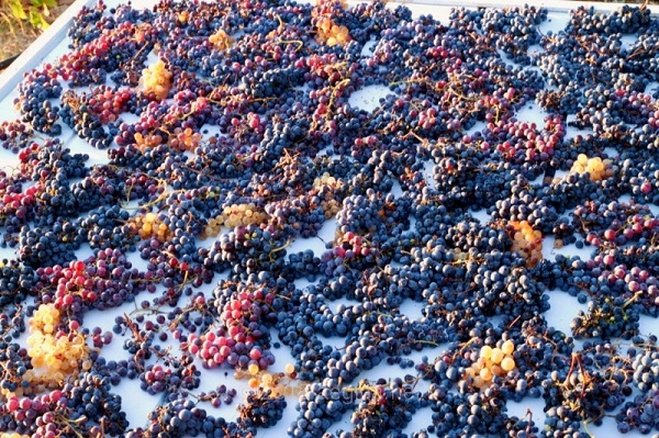 Στην πρώτη μας επίσκεψη – για το πάτημα των κόκκινων σταφυλιών – έγινε αποραγισμός (διαχωρισμός κοτσανιών απο τις ρώγες – απαραίτητη ενέργεια στην ερυθρά οινοποίηση γιατί αν μείνουν τα κοτσάνια ανεβαίνουν οι τανίνες και το κρασί γίνεται πικρό), “πάτημα” και προσθήκη μεταμπισουλφίτ (θειϊκός ανυδρίτης). Η μέτρηση έδειξε 13,5 βαθμούς, που σημαίνει μπωμέ (γράδα) – άψογο για κόκκινο κρασί και μάλλον δεν θα χρειαστεί διόρθωση. Τώρα ακολουθεί το στάδιο της συνοινοποίησης για 7-8 μέρες (ζύμωση μούστου μαζί με τις “σπασμένες” ρώγες προκειμένου να συμμετάσχουν και τα κόκκινα φλούδια στον χαρακτήρα-γεύση του κρασιού, αλλά και να πάρει βαθύ κόκκινο χρώμα από τις χρωστικές ουσίες που υπάρχουν). Μετά από αυτό ο διάστημα θα γίνει ο τελικός διαχωρισμός μούστου-στέμφυλων με πίεση (τσιπουρίτης) και ο μούστος θα τοποθετηθεί σε ανοξείδωτο βαρέλι για την ολοκλήρωση της αλκοολικής ζύμωσης.» Εδώ ο οικοδεσπότης μας μας δηλώνει: Διόρθωση σημαίνει πως όταν χρειάζονται να ανέβουν οι βαθμοί προσθέτουμε ζάχαρη κοινή (ή καθαρό οινόπνευμα όταν είναι αργά και έχει σταματήσει η αλκοολική ζύμωση). Όταν χρειάζεται να κατέβουν οι βαθμοί προσθέτουμε νερό. Εννοείται ότι αυτό καθορίζεται από το οινολογικό εργαστήριο στο οποίο στέλνουμε δείγμα.