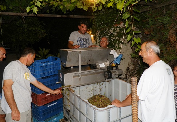 Κι ακολούθησε μια βδομάδα μετά η δεύτερη επίσκεψή μας για το “πάτημα” των λευκών σταφυλιών. Εδώ ο κύκλος είχε ανοίξει – καμιά δεκαπενταριά άτομα βρεθήκαμε να δοκιμάζουμε σε ποτηράκια ρακής τον καινούριο μούστο που μας πρόσφεραν οι νεότεροι οικοδεσπότες μας, τα παλληκάρια που λέγαμε εξαρχής, άλλοι από τους παρευρισκόμενους βοηθούσαν, άλλοι έβγαζαν φωτογραφίες, άλλοι χαζεύανε. Και στο τέλος της περίπου δίωρης συλλογικής “συνεργασίας” μας περίμενε ένα εξαιρετικό τραπέζι με ψητά, μαγειρευτά, κρασί ή ό,τι ήθελε ο καθένας, φιλία, καλή διάθεση ενώ το debate στην τηλεόραση μάλλον πήγαινε χαμένο – υπήρχαν αλλού προτεραιότητες πιο επείγουσες.