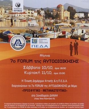 Το φλέγον θέμα του Προσφυγικού – Μεταναστευτικού θα είναι το αντικείμενο του 7ου Φόρουμ Αυτοδιοίκησης που συνδιοργανώνουν η ΕΝΩΣΗ ΔΗΜΑΡΧΩΝ ΑΤΤΙΚΗΣ με την ΠΕΔΑ υπό τη αιγίδα της ΚΕΔΕ στην Αίγινα το ερχόμενο σαββατοκύριακο 10 – 11 Οκτωβρίου 2015.