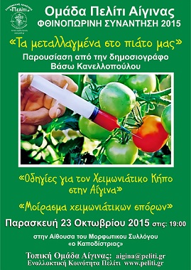 Την Παρασκευή, 23 Οκτωβρίου, στις 7μμ, στο Μορφωτικό Σύλλογο Αίγινας η κ. Βάσω Κανελλοπούλου θα μιλήσει με θέμα: “Τα μεταλλαγμένα στο πιάτο μας”και θα ακολουθήσει συζήτηση.