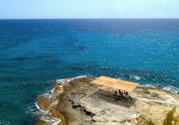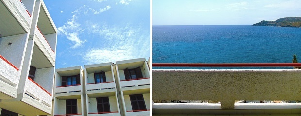 Από τη μικρή εκκλησία στην άκρη της παραλίας φαίνεται όλος ο οικισμός. Από εκεί φαίνεται και το ξενοδοχείο Apollo. Πάνω στα λευκά βράχια της ακτής ανάμεσα στο μπλε και το πράσινο ξεπηδά γενναία ένα λευκό πρίσμα, τίποτε παραπάνω.