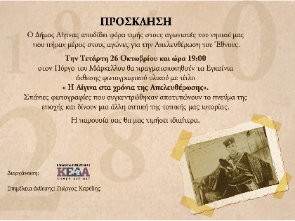 Την Τετάρτη 26 Οκτωβρίου και ώρα 19:00 θα πραγματοποιηθούν τα εγκαίνια έκθεσης φωτογραφικού υλικού με τίτλο «Η Αίγινα στα χρόνια της Απελευθέρωσης» στον Πύργο του Μάρκελλου.