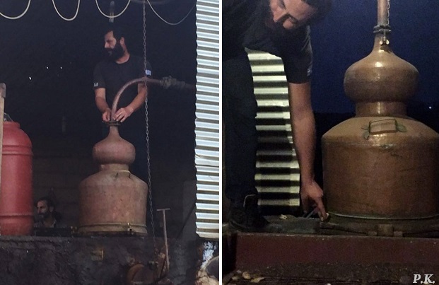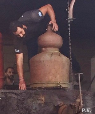 Όταν έρθει η ώρα της παραγωγής, βάζουν στο καζάνι τα τσίκουδα που έχουν ζυμωθεί στα βαρέλια, μαζί με νερό και ανάβουν φωτιά με ξύλα.