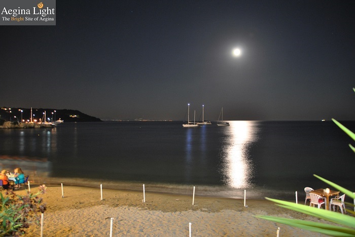 Τα τραπεζάκια των ουζερί πάνω στην άμμο, αποκτούν τώρα την γαλήνη της νύχτας και του τοπίου. Γεμάτα όλα, με εκείνους που επέλεξαν για βραδινή τους έξοδο να δουν το φεγγάρι να βγαίνει μέσα από την ακύμαντη θάλασσα, μακριά από τους ήχους της πόλης.