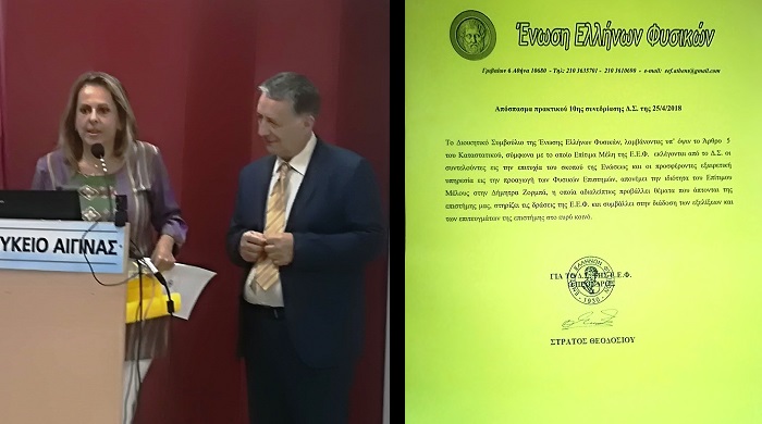 Την επομένη ημέρα στο ΓΕΛ που διεξήγετο το πρότυπο εκπαιδευτικό πρόγραμμα Η ΦΥΣΙΚΗ ΜΑΓΕΥΕΙ, για τους μαθητές της Αίγινας, το οποίο έχει καθιερωθεί πλέον από τον Φεβρουάριο του 2015, η ΕΕΦ με απόφαση Δ.Σ της 25/4/2018, υπογεγραμμένη από τον Πρόεδρό της καθηγητή Πανεπιστημίου κ.Στράτο Θεοδοσίου, ανακήρυξε ΕΠΙΤΙΜΟ ΜΕΛΟΣ ΤΗΣ ΕΕΦ την κα Δήμητρα Ζορμπά για προσφορά εξαιρετικής υπηρεσίας εις την προαγωγή των Φυσικών Επιστημών, η οποία αδιαλείπτως προβάλει θέματα που άπτονται των Φυσικών Επιστημών, στηρίζει τις δράσεις της ΕΕΦ και συμβάλλει στη διάδοση των εξελίξεων και των επιτευγμάτων της επιστήμης στο ευρύ κοινό.”