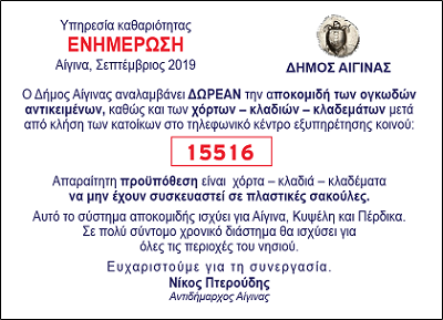 Ο Δήμος Αίγινας αναλαμβάνει ΔΩΡΕΑΝ την αποκομιδή των ογκωδών αντικειμένων, καθώς και των χόρτων – κλαδιών – κλαδεμάτων μετά από κλήση των κατοίκων στο τηλεφωνικό κέντρο εξυπηρέτησης κοινού: