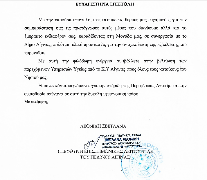 ΑΝΑΚΟΙΝΩΣΕΙΣ Ευχαριστήριο του Κέντρου Υγείας Αίγινας 10/04/2020Add Commentby aeginalight15 Views Written by aeginalight Με την παρούσα επιστολή Προς: -Αντιπεριφερειάρχη Νήσων κ. Θεοδωρακοπούλου Βασιλική -Δήμο Αίγινας FacebookEmail
