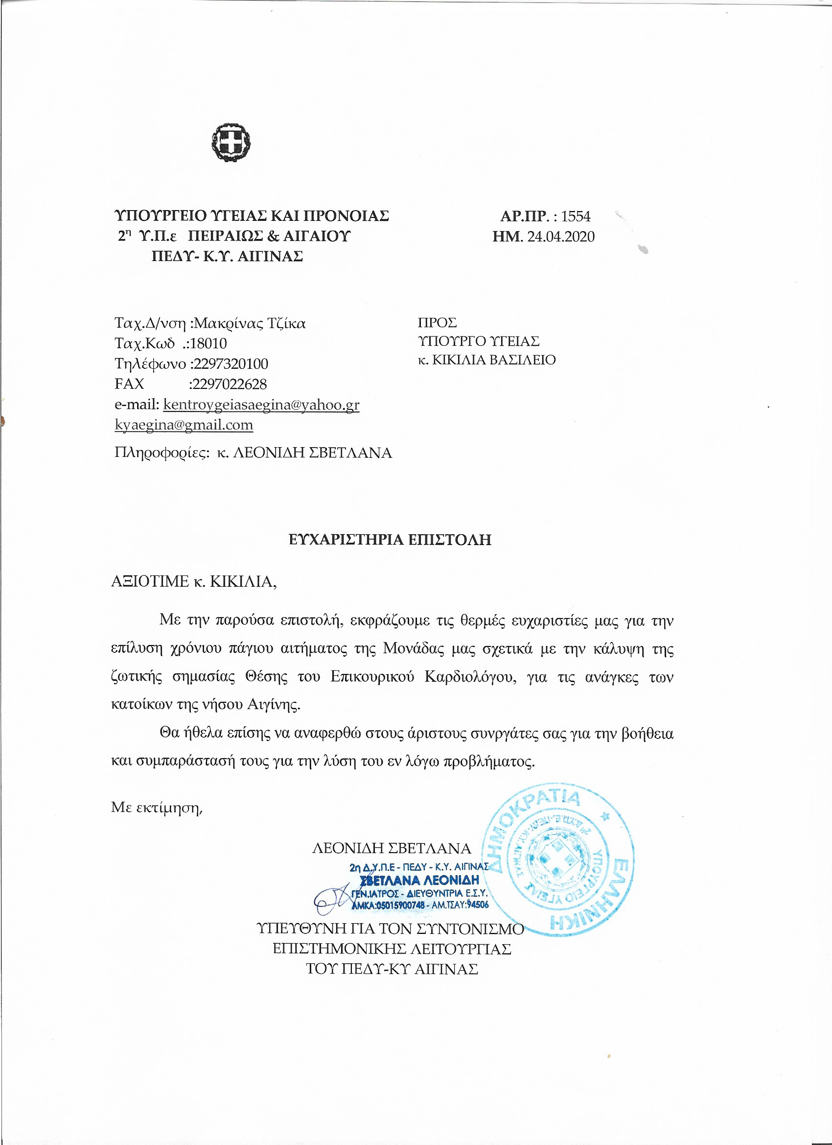 Ευχαριστήρια επιστολή από το Κέντρο Υγείας Αίγινας προς τον υπουργό Υγείας κ. Κικίλια, ο οποίος συνέβαλε για τον διορισμό του Καρδιολόγο: