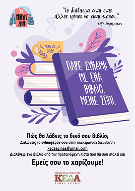 Στην πρωτόγνωρα δύσκολη κατάσταση που όλοι βιώνουμε, τα λόγια [πρέπει να] περισσεύουν. Γι’ αυτό, η Κοινωφελής Επιχείρηση Δήμου Αίγινας ανακοινώνει την έναρξη της δράσης “Πάρε δύναμη με ένα βιβλίο. Μείνε σπίτι”. Πρόκειται για μία πρωτοβουλία ενίσχυσης της γενικότερης προτροπής και ανάγκης για παραμονή του πληθυσμού στο σπίτι.