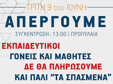 Θέμα: Τρίτη 9/6/2020: οι εκπαιδευτικοί προχωράμε σε 24ωρη ΑΠΕΡΓΙΑ (3ωρη στάση εργασίας τις πρώτες ώρες του πρωινού ωραρίου και για τις υπόλοιπες ώρες 3ωρη από τη Δ.Ο.Ε
