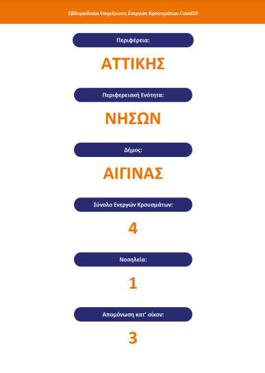 Σύμφωνα με την Εβδομαδιαία Ενημέρωση Ενεργών Κρουσμάτων Covid 19 Γεωγραφικής Αρμοδιότητας Δήμου Αίγινας, όπως απεστάλη από τον Εθνικό Μηχανισμό Διαχείρισης Κρίσεων και Αντιμετώπισης Κινδύνων του Υπουργείου Προστασίας του Πολίτη, στην Αίγινα έχουμε 4 ενεργά κρούσματα εκ των οποίων το 1 νοσηλεύεται και 3 είναι σε απομόνωση κατ΄οίκων.