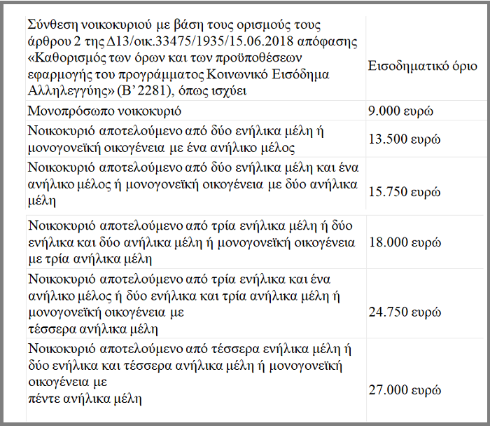 Να έχουν οι ίδιοι και τα μέλη του νοικοκυριού τους, με βάση τους ορισμούς τους άρθρου 2 της Δ13/οικ. 33475/1935/15.06.2018 απόφασης «Καθορισμός των όρων και των προϋποθέσεων εφαρμογής του προγράμματος Κοινωνικό Εισόδημα Αλληλεγγύης» (Β’ 2281), όπως ισχύει, ετήσιο συνολικό πραγματικό (φορολογητέο, αυτοτελώς φορολογούμενο ή ειδικώς φορολογούμενο ή απαλλασσόμενο φόρου) ή τεκμαρτό εισόδημα, όπως αυτό προκύπτει από τις τελευταίες εκκαθαρισμένες δηλώσεις φόρου εισοδήματος των μελών του νοικοκυριού για τις οποίες έχει λήξει η οριζόμενη από τις κείμενες διατάξεις ή η παραταθείσα με οποιονδήποτε τρόπο προθεσμία υποβολής, με την επιφύλαξη προσκόμισης των δικαιολογητικών μεταβολής οποιουδήποτε εισοδηματικού ή περιουσιακού στοιχείου ή σύνθεσης νοικοκυριού, όπως αυτά προβλέπονται στο άρθρο 3, έως τα όρια του παρακάτω πίνακα: