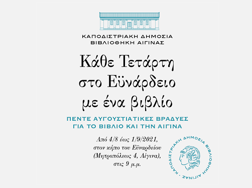 Με μία διάλεξη της Αμάντας Μιχαλoπούλου για την Αίγινα και μία έκθεση βιβλίου κλείνουν αυτήν την Τετάρτη 1 Σεπτεμβρίου οι εκδηλώσεις της Καποδιστριακής Βιβλιοθήκης στο Ευνάρδειο