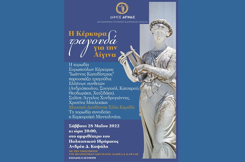 Ο Δήμος Αίγινας και η Αντιδημαρχία Τουρισμού & Δημοσίων Σχέσεων, με την υποστήριξη του Πολιτιστικού Ιδρύματος Ανδρέα Δ. Καψάλη, σας προσκαλούν σε μια μουσική βραδιά με κερκυραϊκό χρώμα.