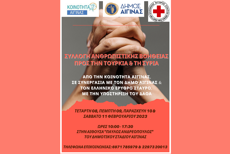 Θετική ανταπόκριση στο κάλεσμα του Ελληνικός Ερυθρός Σταυρός – Hellenic Red Cross  για τη συγκέντρωση ανθρωπιστικής βοήθειας προς τους σεισμόπληκτους στις περιοχές της Τουρκίας και της Συρίας αναλαμβάνει η Κοινότητα Αίγινας σε συνεργασία με το Δήμο Αίγινας και με την υποστήριξη του Δημοτικού Αθλητικού Οργανισμού Αίγινας (ΔΑΟΑ).